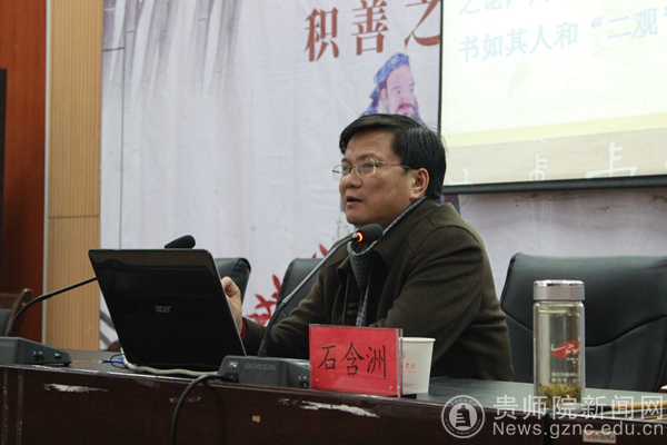 11月21日下午,校党政办副主任、副教授、我省知名书法家石含洲在学校道德讲堂开展了以“书法智慧与智慧人生”为主题的讲座,现场师生近200人参加了活动,讲座由校党委宣传部副部长孙秀华主持。