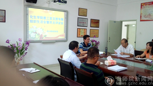 根据《关于在全省第二批党的群众路线教育实践活动中基层党组织召开专题组织生活会并开展民主评议党员工作的实施方案》(黔群组发([2014]37号)(以下简称《方案》)文件的要求,2014年8月25日下午2点,化生学院在宁静楼525会议室召开了“化生学院教工党支部专题组织生活会暨民主测评会第一次会议”。全体党员参加会议,会议由化生学院团委书记周旭清主持。
