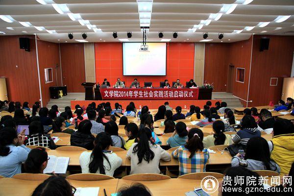 为践行群众路线教育实践活动精神,真正落实“从群众中来,到群众中去”,加强学生社会实践能力,丰富第二课堂,4月9日,文学院2014年学生实践活动启动仪式在文韬苑学术讲堂举行。出席会议的领导有副校长张承鹄,校友办主任洪红,校质量监督办公室主任、贵州省陶行知研究会秘书长邓琴,文学院院长吴俊、党委书记韦丹,副院长夏徳靠,文学院全体专职辅导员,行知社、学生会信息部全体成员及12、13级广电、文秘的同学参与了此次活动。