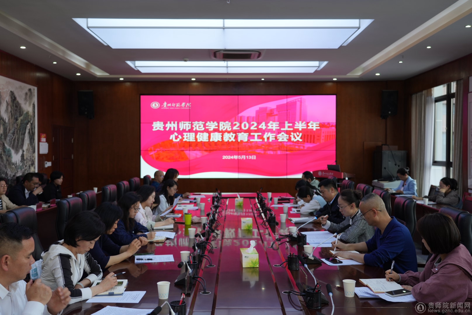 心理健康教育与咨询中心副主任谢其利首先领学了《贵州省全面加强和改进新时代心理健康教育工作实施方案(2024——2026年)》,对方案中的总体要求、主要任务和保障措施结合工作实际进行了解读;随后谢其利通报了本学期开学至今我校心理健康教育工作总体情况,并对“5.25心理健康活动月”及近期心理健康教育相关工作进行了具体安排。