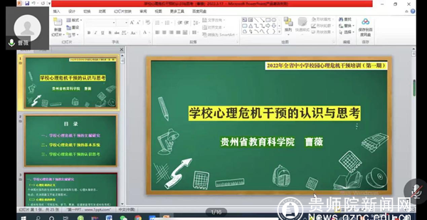 本网讯 当前,我国新冠肺炎疫情呈现点多、面广、频发的特点,防控形势严峻复杂,“外防输入、内防反弹”压力持续增加。为切实提升疫情下全省教师应对校园心理危机事件的识别和干预能力。近日,由贵州省教育科学院主办,万象城网页版承办、教科院协办的2022年贵州省中小学校园心理危机干预专题培训(第一期)成功举办,各市(州)100多名专(兼)职心理辅导教师通过腾讯会议参加了培训。