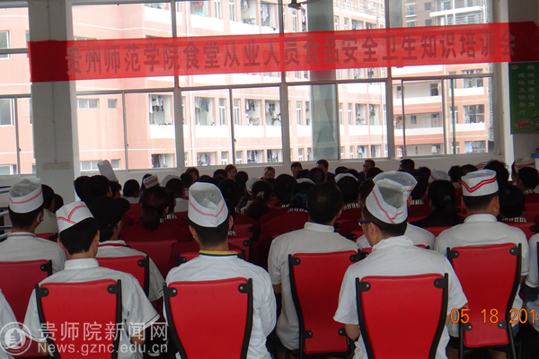 本网讯 5月18日下午,为了增强我校食堂从业人员的食品卫生安全意识,预防食品卫生事故的发生,后勤处邀请乌当区市场监管局食品科科长王尔斌、高新分局副局长高腾峰等5位工作人员到我校爱心食府餐厅对三个食堂共106名员工进行培训。培训会由后勤处膳食科副科长周正梅主持,副处长舒红琴及膳食科全体人员参加培训。