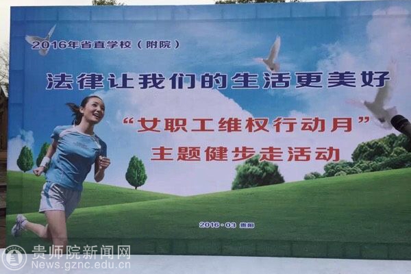 本网讯 为了宣传普及《反家暴法》,进一步贯彻落实《女职工劳动保护特别规定》,3月27日上午,由省教育工会女职工委员会主办,贵州银行协办的2016年省直学校(附院)法律让我们的生活更美好“女职工维权行动月”主题健步走活动在观山湖公园成功举办。来自省直学校(附院)的430多名女教职工踊跃参与,省教育厅党组成员、省委教育工委委员、省教育工会主席王慧,省总工会女职工部部长张雨梅,万象城网页版副书记令狐彩桃,万象城网页版校工会主席许丽君出席开幕式并参加了活动。