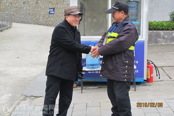 本网讯 2月8日上午,校党委书记陈扬在党政办主任芦军和宣传部长邹晓青的陪同下,到学校看望慰问春节期间坚守岗位的值班人员,为他们送上节日问候和新年祝福。