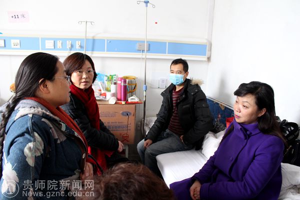 本网讯 1月15日下午,校党委副书记令狐彩桃、校工会主席许丽君、化生学院院长王超英、化生学院基层工会主席冉晓燕等一行5人到医院看望并慰问了化生学院生病教师张进。