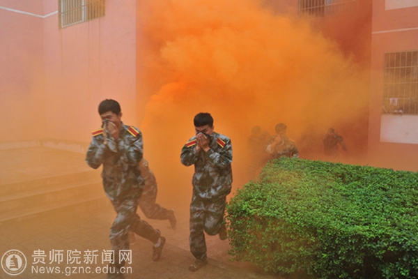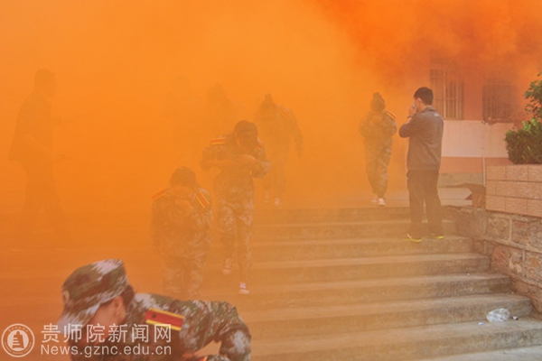上午10时,演练总指挥令狐荣锋下达“演练开始”的指令,演练正式开始。伴随着急促刺耳的警笛声,工作人员依次拉开了各楼层的消防演练专用烟雾弹,滚滚浓烟包裹在宿舍,学生们在保卫处工作人员及保安的引导下,用手帕或者毛巾捂住口鼻,从高层到低层按照指定的路线快速、安全、有序的撤离“火灾”现场。