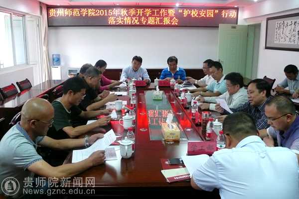 9月8日上午,省政府教育督查组2015年秋季开学工作暨‘护校安园’行动落实情况督查组唐建荣组长一行来校检查工作,校党委书记陈扬、副校长令狐荣锋、保卫处、党政办、教务处、学工部、后勤处负责人参加汇报会。会议由保卫处副处长杨林主持。