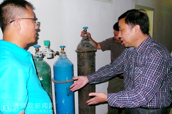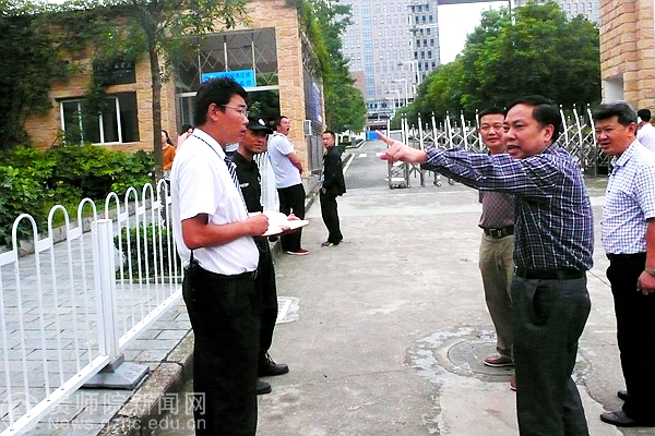 为落实平安校园的建设工作,认真贯彻落实近期全省维稳及省教育厅安全稳定工作会议精神,8月26日下午,副校长令狐荣锋率领保卫处、教务处、后勤处、基建处、物管公司等部门相关人员于新学期伊始对校园及周边治安综合治理情况、校内建筑工地、食堂、商铺、实验室、校园交通秩序等进行了安全大检查,特别对化生学院、物电学院实验室的危险化学药品、用气用电用水、食堂液化气瓶的使用情况进行了一一细查。