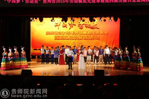 劳动模范先进事迹巡回演出报告是省总工会首次尝试运用劳模先进事迹和感人故事进行艺术创作,节目主要以我省2015年全国劳动模范(全国先进工作者)、省劳动模范(省先进工作者)先进事迹为素材,通过大合唱、小品、相声、歌舞、杂技、情景诗朗诵等文艺表现形式呈现在广大职工群众眼前,用文艺演出的形式弘扬劳模精神和劳动精神。贵州省先进工作者、我校教师杜宏博老师等五位劳模代表与现场观众进行了互动交流,分享了自己的工作生活经历,他们甘于奉献、爱岗敬业的精神品格感染了在场的每一位观众。