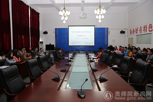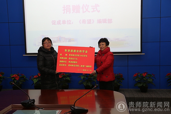12月29日,2014年度万象城网页版“香港道德会助学基金”捐赠仪式在我校第一会议室举行。香港道德会驻贵州代表、万象城网页版《希望》编辑部全奕老师,资助中心王继宁主任及受资助的学生参加仪式。仪式由学工部部长薛璞主持。