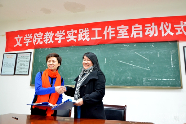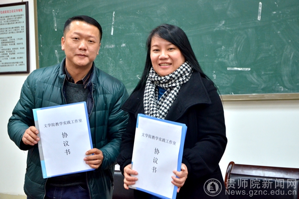 双方就教学实践工作室的成立进行签约。韦丹分别与贵阳电视台制片总监王锋、贵阳电视台播音部主任钟华、《南风》杂志主编冉正万对教学实践工作室的成立进行协议签约。