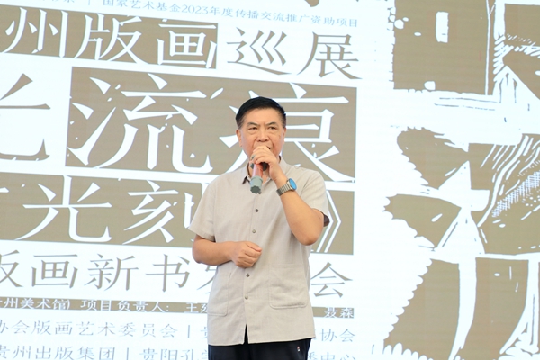 贵州人民出版社社长朱文迅在发言中说到,这次展览将贵州版画的百年历程展现得淋漓尽致,凝聚了一百年来艺术家们的心血与智慧。希望通过这次展览,能够促进文化交流,让更多人了解和认识贵州的独特艺术魅力。他还提到,《时光刻痕——百年贵州版画》一书标志着贵州版画在百年历程中取得了新的重要成就,不仅是对贵州版画艺术的一次重要总结,更是对贵州版画艺术家们辛勤创作的高度肯定,为后人了解贵州版画的历史和文化底蕴提供了珍贵的参考。