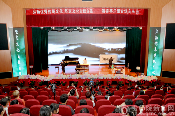 本网讯 用中华优秀传统文化浸润人心是学校践行文化育人理念的重要举措,5月31日晚,学校音乐舞蹈学院清音筝乐团在逸夫楼演播厅举行了专场音乐会。校党委副书记熊世桓,相关职能部门代表及各学院师生代表受邀观看了本场音乐会。