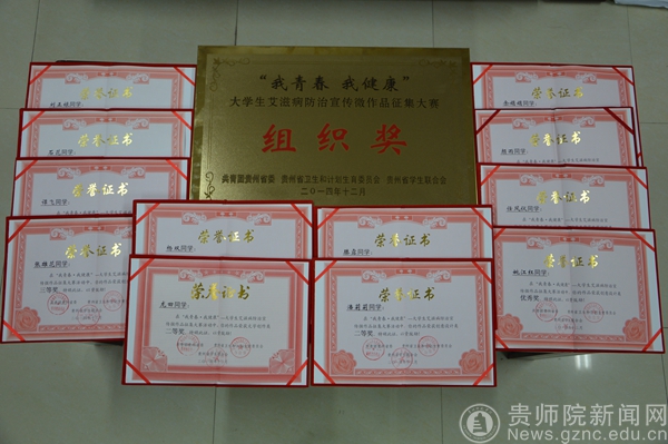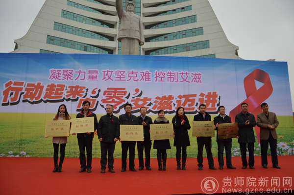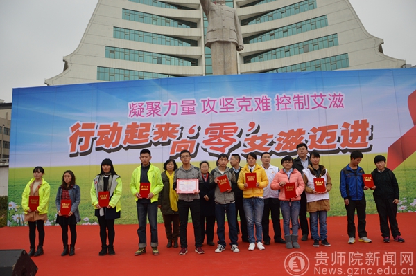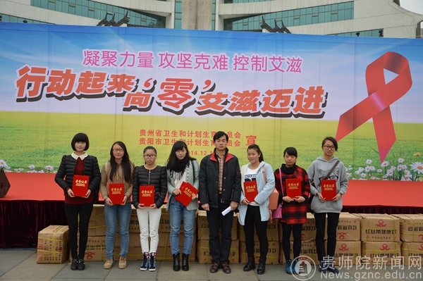 12月1日是第27个“世界艾滋病宣传日”,由省卫生厅、团省委主办,以“行动起来,向‘零’艾滋迈进”为主题的大学生防艾志愿者集中宣传暨防艾微作品征集大赛颁奖活动于12月1日上午在贵阳市筑城广场举行。我校团委王文杰老师带领防艾协会部分志愿者及获奖代表应邀参加此次活动。