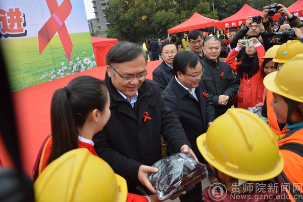 活动现场,副省长何力慰问参与防艾宣传的工作人员和大学生志愿者,巡视防艾宣传展板,观看贵阳中医学院的大学生志愿者编织的防艾中国结,并向农民工发放装有防艾宣传资料和个人护理用品的健康包。