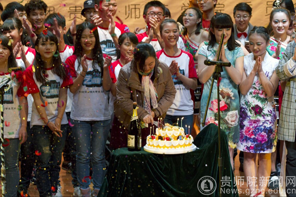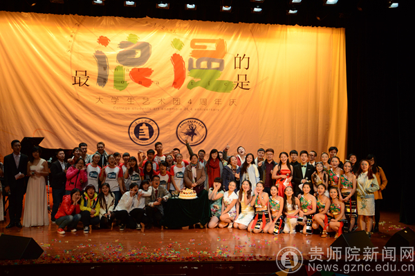 演出的最后,大学生艺术团的新老成员在台上畅谈感触,他们都在这里有很多美好的回忆,他们一起排练,一起过节日,一起拿着蛋糕祝艺术团生日快乐。演出获得圆满成功,相信在他们共同努力下艺术团明天更辉煌。