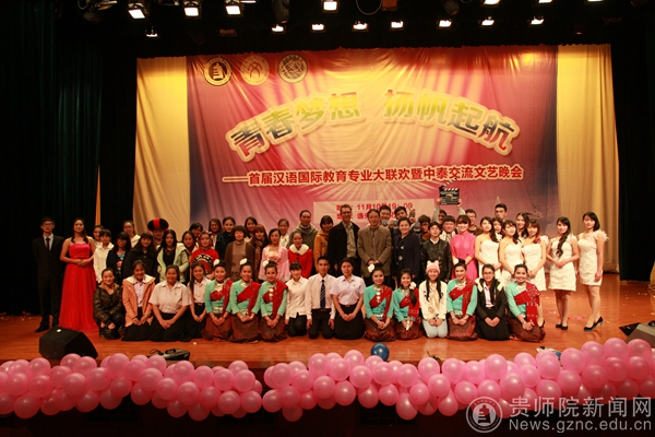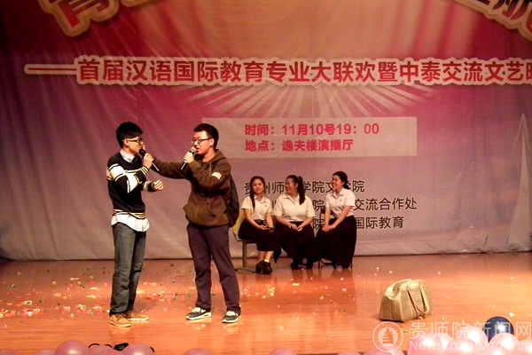 扫榻出门迎君至,与君欢度当此时!11月10日晚,由对外交流合作处、文学院主办,汉语国际教育专业承办的“青春梦想,扬帆起航——首届汉语国际教育大联欢暨中泰交流文艺晚会”在逸夫楼演播厅盛大开演。对外交流合作处处长王又新、文学院院长吴俊、对外交流合作处副处长陶秀筑、对外汉语教研室主任杨荫冲及部分对外交流合作处、文学院、外国语学院的老师们出席了本次晚会,汉语国际教育专业全体学生与闻风而来的师院学子们一同观看了本次晚会。