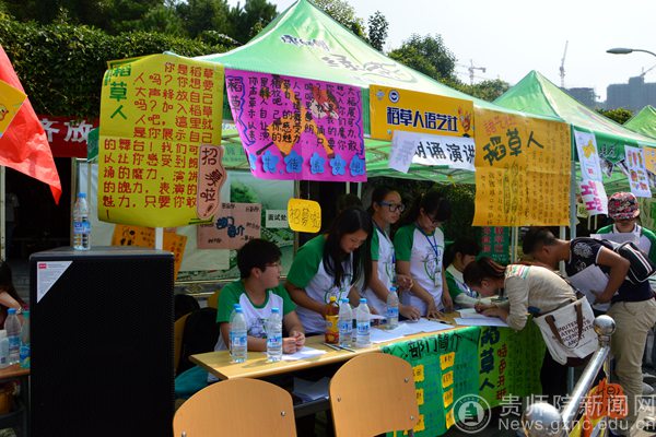 稻草人语艺社策划、执行、总结;前期、中期、后期准备一应俱全。社员统一穿着绿色的会服,口中呼喊着“朗诵、演讲、舞台剧;相声、小品、微电影”吸引往来新生。其中社长更充当“人工喇叭”现场表演单口相声。招新棚现场热闹非凡,有不少新生被吸引停步欣赏。记者团更是把招新任务交给了第一次招新招收的新社员,让新社员展开招新工作。