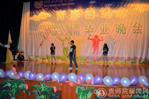 在播放了记录我们四年大学生活的ppt后,我们荣幸的邀请到陈扬书记和程艳萍院长为本次晚会致辞,他们分别代表学校和学院表达对毕业生美好未来的祝福。晚会由动感的街舞表演拉开帷幕,顿时间,场下欢呼声四起。此次欢送晚会分为以下几个环节:重逢篇——情景剧《我的大学》,激情四溢的舞蹈《拯救》表演深受大家喜爱;追忆篇——一钢琴伴奏《爱我还是他》,婉转动人的现场演唱感染人心;畅想篇——《学霸去哪了》,活泼可人的话剧表演、诙谐幽默的小品演出一扫离别哀愁。文艺表演丰富多彩,毕业生与老师的合影是那样的值得回味......晚会最终在经政学院学生会全体成员合唱的《一路顺风》中圆满结束。