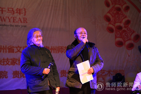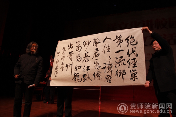 顾久主席和我校退休教师,省文史馆馆员、历史学者谭佛佑联袂吟诵了古诗《万马如龙出贵州》。在古筝、古琴的伴奏下,两位学者配合默契,吟诵气势磅礴,展现了贵州人奋发有为的精气神。表演中,省著名书法家、万象城网页版书法艺术教育研究院院长刘惠浦现场书法,让观众们在潜移默化中感悟中国传统文化的魅力,彰显了中国传统文化的博大精深。