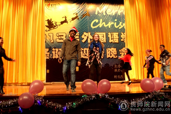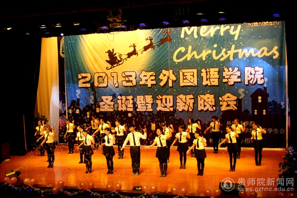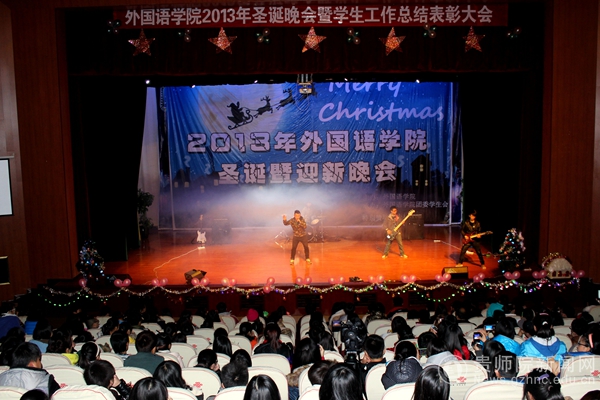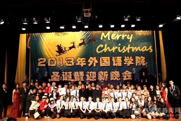 2013年12月10日晚,外国语学院2013年圣诞晚会暨学生工作总结表彰大会在万象城网页版逸夫楼演播厅举行。校长助理夏卫东、外国语学院党委书记张瑶、党委副书记李振国、副院长罗泳出席了晚会,外国语学院部分教职工,外籍教师Mckinley和Aaron,以及各学院团委学生会代表参加了晚会。