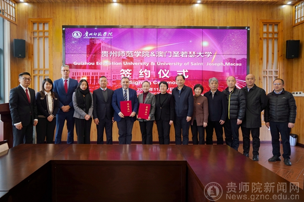 参加本次签约仪式的还有圣若瑟大学发展处处长杨承东、工商法律学院院长刘钰馨、工商管理系系主任谢尔盖·戈麦斯、校友代表区家欣;贵州省委统战部港澳台统战工作处处长孔祥龙、四级调研员罗杨,贵阳市南明区政协委员、澳门中华创新科技发展促进会监事长田蕾;省教育厅港澳台办干部杨胜本;贵州省人民政府港澳事务办公室港澳事务处处长陈放、港澳事务处二级调研员彭健康;以及我校校党委统战部、科研处、教务处、对外交流合作处、商学院、文学与传媒学院、外国语学院、数学与大数据学院、创新创业学院相关负责人。