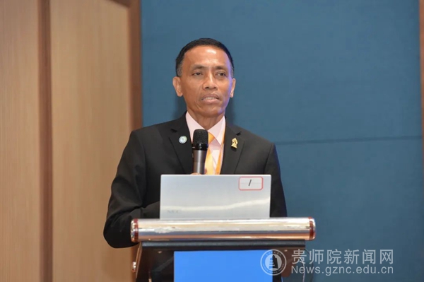 Flg.Off.Sompon Pandam(宋鹏•邦丹)致辞,他指出,中国——东盟机甲大赛是一个平台,通过这个平台,鼓励来自不同国家的学生创造机器人,将科学知识与自身擅长领域相结合,为创新机器人技术的研究奠定基础,是一项值得鼓励年轻人去实践和探索的教育活动。Flg.Off.Sompon Pandam(宋鹏•邦丹)代表泰国教育部职教委员会向学校赠送了礼物。