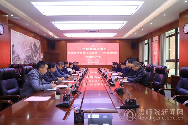 本网讯 3月1日,“贵州教育史馆——贵州省博物馆(纪念馆)十大精品展览”荣誉称号授牌仪式在我校举行。省文旅厅副厅长袁伟、人事处处长陈志群、博物馆与社会文物处副处长杨敏、省美术馆馆长潘闻丞、省博物馆副馆长向青,我校党委书记石培新,校党委委员、副校长邹晓青出席了授牌仪式。授牌仪式由邹晓青主持。