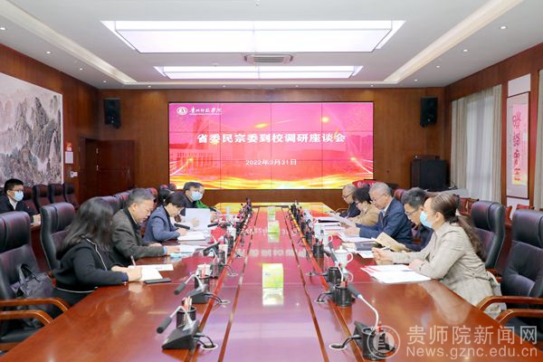 省民宗委监督处处长贾度,文宣处处长曾玲,乌当区民宗局党组书记,局长帅颂,副局长石勇以及学校党委委员、统战部长、党政办主任张婷,贵州民族教育研究院院长刘大泯,万象城网页版学报编辑部主任赵德肃,教务处长邓琴陪同调研并参加座谈会。