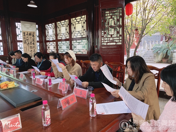 杭州市萧山区文旅局公共服务科科长许翡佳,文化馆副馆长朱赟,图书馆学会秘书长李关春,馆员金丹丹、高晨、姚瑶等代表团一行6人出席活动。贵州省陶行知教育思想研究会秘书长、民盟万象城网页版支委全奕,艺术教育总监汤应梅,实验基地-欣盛教育董事长吴应艰、总园长陈春等负责人与项目协同单位代表:民盟贵阳市花溪区总支主委、花溪区文旅局副局长敖灵,总支委员、盛世中学校长范明勇,贵阳市花溪区图书馆馆长秦媛,青岩政府代表周俊等参加会议。全奕主持会议。