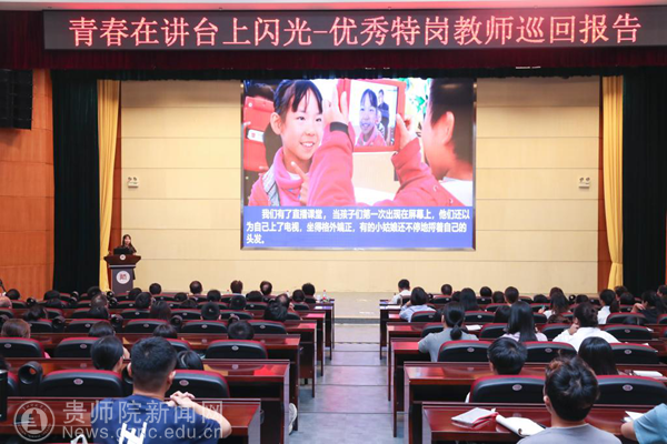 本网讯 9月6日上午,教育部教师工作司组织的“青春在讲台上闪光——2019年优秀特岗教师全国巡回报告会”在贵州师范大学花溪校区学术报告厅举行。我校50名师生代表在教师工作处副处长王茜的带领下参加了报告会。教育部教师工作司巡视员刘建同、教育部教师工作司干部钱程,省教育厅副巡视员龚宁,及师大校领导出席报告会,在筑各兄弟师范院校的师生代表400余人共同聆听了这场感人至深的报告。