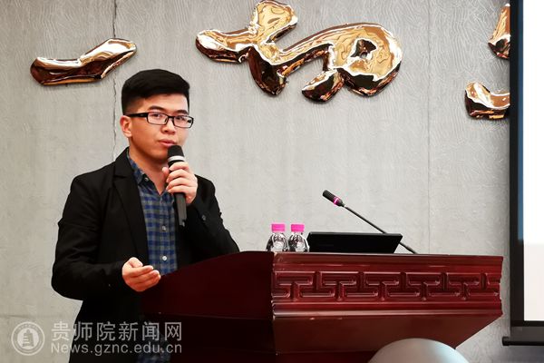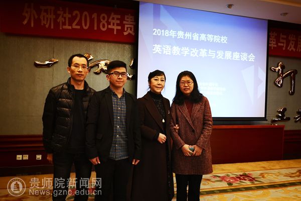 本网讯 11月25日,由贵州省外语学会、贵州省大学外语教学研究会和外语教学与研究出版社共同举办的“2018年贵州省高等院校英语教学改革与发展座谈会”在贵阳贵州饭店国际会议中心二楼安顺厅举行,省内各高校的院系负责人、教研室负责人、教师代表师参加了此次座谈会。贵州省外语学会会长、我校外国语学院院长余学军应邀参加并作为主持人主持英语专业教育交流分享会,外国语学院副院长罗泳、教研室主任代表张录文和教师代表程俊龙一同参加了此次座谈会。