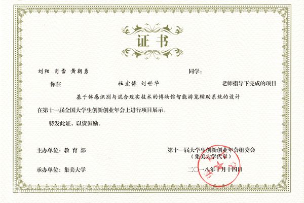 本届年会共收悉部属高校和地方教育主管部门推荐项目,833项,其中,学术论文392篇,展示项目441项。经过相关学科专家初评、“国创计划”专家工作组、协作组复选,遴选出参加第十一届全国大学生创新创业年会的学术论文176篇,创新创业展示项目218项,共计394项。我校创新创业项目“基于体感识别与混合现实技术的博物馆智能游览辅助系统的设计”(学生:刘阳 肖雪 黄朝勇 指导教师:杜宏博 刘世华)经过层层评审获准参加现场的项目展示。