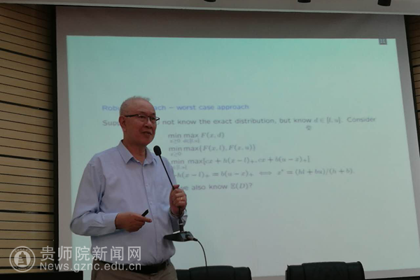 Jie Sun作了题为“Solving Monotone Stochastic Variational Inequalities and Complementarity Problems by Progressive Hedging”的学术报告。Jie Sun教授由一个经典的数学建模例子----报童模型出发,给老师和同学们讲解了什么是随机优化(Stochastic Optimization),进而引申到金融优化管理,如何对随机过程做优化决策。随机优化是处理数据带有随机性的一类数学优化问题,它与确定性数学优化最大的不同在于其系数中引进了随机变量,这使得随机优化比起确定性数学优化更适合于实际问题。