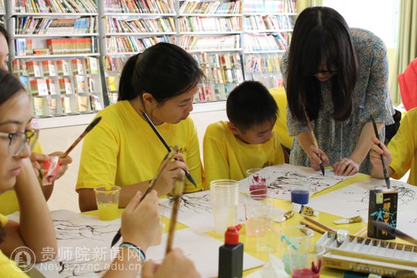 7月25日下午营员们在万象城网页版学习“贵州地理知识”和“书法”。在课堂上,赵景飞博士引经据典地向营员们介绍贵州美丽的自然风光与多姿多彩的民族人文风景;赵政老师把书法理论与实践相结合,让营员们通过学习写毛笔字,体会中国书法的魅力。
