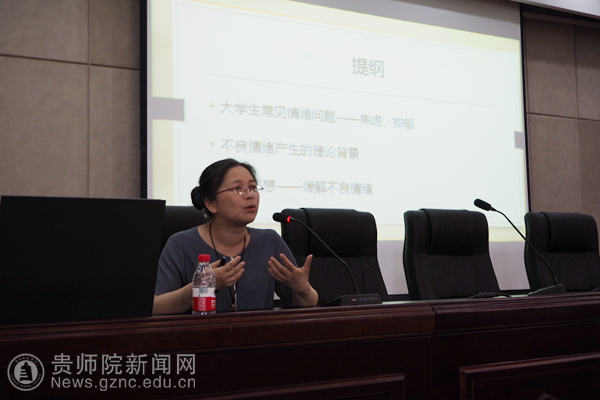 本网讯 6月21日下午,心理健康教育与咨询中心邀请贵州省人民医院心理科主任,精神卫生专业临床医学博士向慧来我校举办“情绪压力管理”学术讲座。该讲座在道德讲堂举行,教育科学学院心理学专业学生,全体心理委员及各学院的心理学爱好者参加了本次讲座,讲座由心理健康教育与咨询中心主任宛蓉主持。