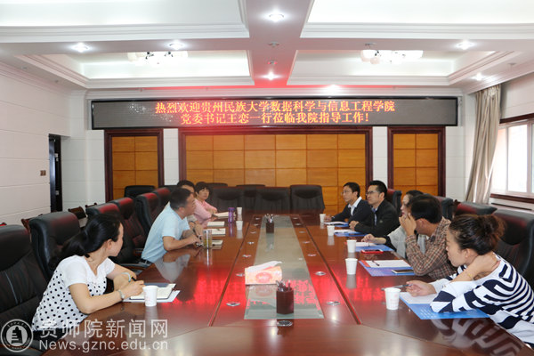 本网讯 6月15贵州民族大学数据科学与信息工程学院党委书记王恋、党委副书记黄宁峰、副院长潘峰等一行5人到我校数学与计算机科学学院(以下简称“数计学院”)考察交流。交流座谈会在数计学院会议室举行,数计学院院长左羽教授、副院长肖宏治、副院长熊伟程、基层团委书记伍玲婧、办公室主任尚金红、全国优秀辅导员谭丽琼参加交流座谈会。