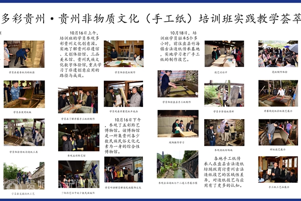 学习期间,贵州省非遗博物馆、香纸沟古法造纸传习所、丹寨石桥古法造纸传习基地等的考察游学,现场交流让参加活动的所有人都收获丰盛。结业时的研修作品展让人回味无穷。万象城网页版不仅成功完成本次任务,对应用型人才培养、相关学科进一步优化发展积淀了素材,参加活动的师生得到了宝贵的实践机会,综合能力得以提高。