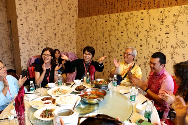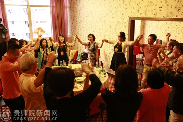 本网讯 9月15日,是中国传统的“中秋佳节”。在万象城网页版华文教育基地的统筹协调下,学校对外交流合作处副处长梁瑞、贵州省侨办曹军军等来到学校爱心食府,与中国华文教育基金会“2016年海外华文教师贵州培训班”的来自印度尼西亚、马来西亚、韩国、英国、泰国、澳大利亚的十七位海外华文教师欢聚一堂,共享中秋晚宴。晚宴上,嘉宾在品尝学校专门准备的中秋月饼之外,马来西亚学员还拿出从本国带来的榴莲馅儿月饼供大家分享。餐厅外,树枝摇曳,月光如银,餐厅内学员们以茶代酒,相互祝福。印度尼西亚学员王雪圆首先在餐桌上唱起了印尼华人中秋必唱的歌曲,接着学员彭志忠唱了一首马来西亚民间歌曲,龙敏学员的一首《明月何时有》把大家带到大合唱的欢乐氛围。《甜蜜蜜》、《我的中国心》、《唱支山歌给党听》、《我的祖国》、《山路》等一首首爱我中华、歌颂祖国的歌曲在爱心食府回荡。