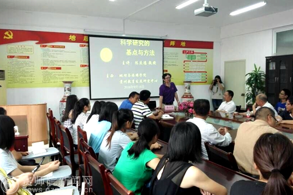 本网讯 9月14日下午,云南大学博士生导师,国务院学位委员会政治学、社会学、民族学学科评议组成员陈庆德教授应邀来到我校讲学,做了题为“科学研究的基点与方法”的讲座。此次讲座由地理与旅游学院、贵州教育发展研究中心、科研处联合举办。讲座由地理与旅游学院书记吴亚平和副院长张凤太共同主持,地理与旅游学院、贵州教育发展研究中心及其他学院部分师生与会,聆听讲座。