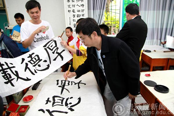 为了让来宾们真真切切的感受书法的魅力,校方还特意让柬埔寨校长团的成员拿起毛笔,体验了一回书法创作。虽然是第一次写毛笔字,但经过中国朋友的帮助和自己认真的临摹,柬埔寨客人们最后的作品看起来还颇为流利。