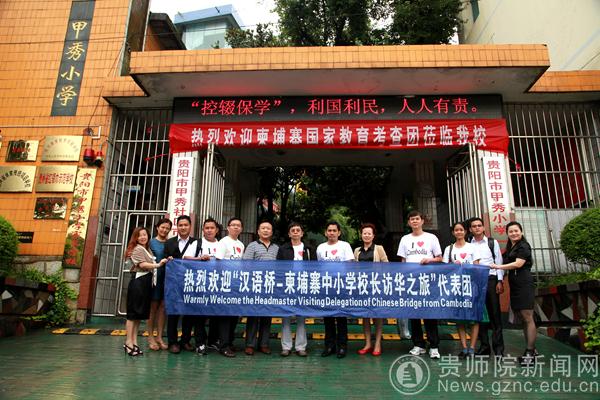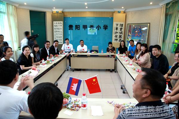 当天尽管因为连日来的暴雨天气,位于南明河畔的甲秀楼水位暴涨而通行受阻,但柬埔寨校长团还是在我校对外交流处处长王又新的陪同下如约来到甲秀小学进行访问。甲秀小学校长汪伟携学校主要领导及师生代表对校长团的到来给予了隆重的接待。