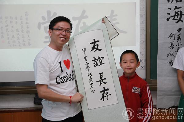 此外柬埔寨校长们每人还收到了一份特殊的礼物——甲秀小学的孩子们创作的书法作品。据了解,这些书法作品都是都是同学们精挑细选的得意之作。看着小朋友们送来一幅幅精美的墨宝,校长团成员们高兴不已,不断称赞“中国学生多才多艺”。