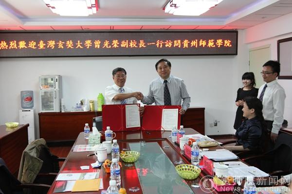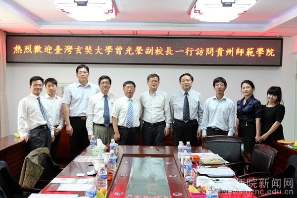 王又新处长介绍了此前两校交流的大致情况后,李存雄校长对曾光荣副校长一行的莅临表示热烈欢迎,他简要介绍了我校目前发展规模、专业设置、教学科研的情况,表达了与玄奘大学开展学生、教师交流合作的意愿。玄奘大学曾光荣副校长感谢李校长热情接见,详细介绍了玄奘大学的发展历史和办学理念,期盼在广播电视编导、艺术设计等重点学科能开展深入合作。随后,我校令狐荣峰副校长简要介绍了我校对外交流情况,回顾了他前一周在台湾访问情况,表示对两校合作的前景比较乐观。夏卫东校长助理也认为两校合作空间很大,要求对外交流合作处做好对接工作,力争下半年开展实质性合作。台湾玄奘大学传播学院陈伟之院长表示:两校的交流不仅能促进双方在教育文化上的交流,而且一定能促进两地青少年之间的互动和理解,有利于两岸的统一大业。