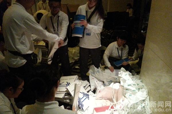 图为我院志愿者在后场进行会议资料分发装袋工作