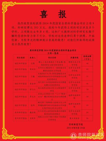 2014年,我校共获国家自然科学基金项目9项,其中地区科学基金项目7项,青年科学基金项目2项,科研经费达393万元。