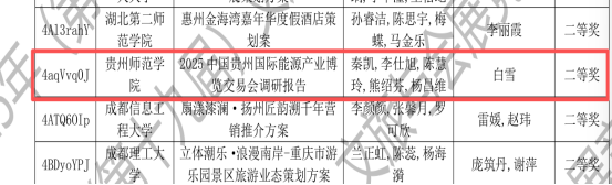 由白雪老师指导,秦凯、李仕旭、陈慧玲、熊绍芬、杨昌维团队完成的《2025中国贵州国际能源产业博览交易会调研报告》,通过实地调研与数据分析提供专业优化方案,在会展项目调研赛道荣获国家级二等奖。