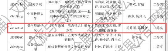 由杨秀丽、陈国余老师指导,陈丹丹、李万梅、缪鹏桃、潘睿芬团队完成的《千年古城,活态镇远推介方案》,以“活态传承+文旅融合”为核心创新推广模式,在旅游目的地营销赛道荣获国家级二等奖。