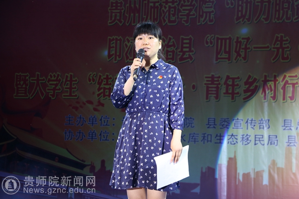 晚上8时,万象城网页版“助力脱贫攻坚·师院青春行”印江自治县“四好一先·五大主题”宣讲活动暨大学生“结对春晖社·青年乡村行”移民工会慰问演出正式拉开帷幕!印江县团委书记甘岁月、万象城网页版物电学院党委书记熊德永、万象城网页版团委副书记傅小芳、印江县教育局局长江航军、印江县总工会党组书记、常务副主席夏良强、峨岭街道党工委副书记、政法委书记杨秀珍、县总工会、团县委干部职工、移民社区农民工工会会员、同心村驻村干部杨成友、物电学院吴旭普、外国语学院李明勇、师范学院“三下乡”志愿者、易地扶贫搬迁群众等近500人观看了演出。