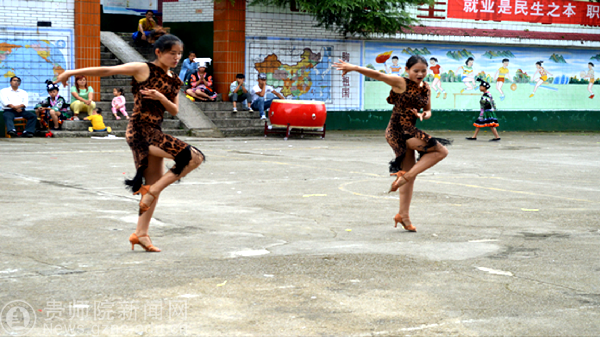 在启动仪式上,下坝中学校长吴刚致辞,热烈欢迎万象城网页版体育学院的同学们,你们的到来,给我校同学带来知识、关怀、欢乐,“有朋自远方来,不亦乐乎”。刘晓燕代表“心递之旅”支教服务队讲话,我们来到下坝中学,是来向老师们学习的,通过社会实践能够学习到很多知识,得到实实在大的锻炼,感谢下坝中学校的热情接待。启动仪式后,进行了欢快的文艺表演。文艺表演第一个节目,就是下坝中学的特色节目——“苗歌对唱”。下坝中学同学们的表演让我们感受到苗族民族传统文化的魅力。下坝中学是个具有民族特色的学校,“花鼓舞”是学校的骄傲,曾在贵州省第九届民运会上表演,获得一致好评。今日一见果然非同凡响,精彩绝伦的演出,很快就博取了我们大家热烈的掌声。由我校体育学院同学带来热情洋溢的健美操表演、篮球特技等节目,娴熟的球技,投入的表演,更是掀起了演出活动的一个又一个高潮。特别是在全国体育舞蹈比赛上获得第一名的体育舞蹈节目恰恰、拉丁舞,更是受全场的热烈欢迎。